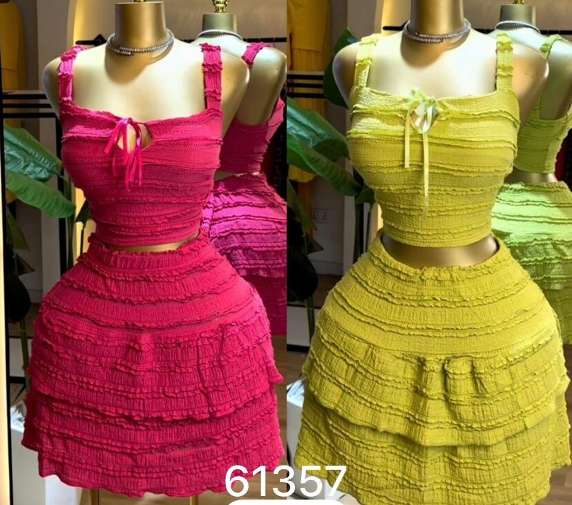 Ensemble chic et coloré pour femme avec jupe et top volantés. Confectionné avec un tissu texturé, il offre un style bohème et élégant. Parfait pour sorties estivales ou occasions spéciales. Disponible en rose et vert vibrant pour ajouter du peps à votre garde-robe.