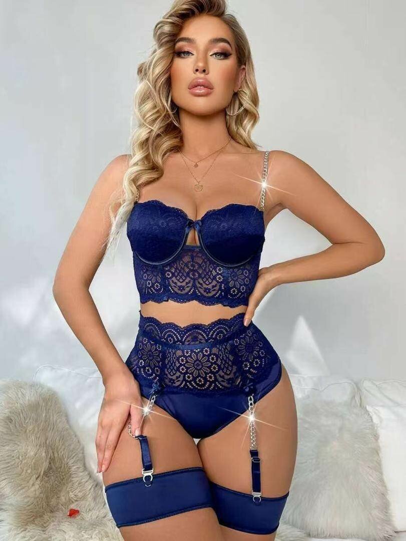 Découvrez cet ensemble lingerie en dentelle bleu, comprenant soutien-gorge, culotte et porte-jarretelles. Conçu pour les femmes qui aiment la lingerie élégante et sexy. Idéal pour les occasions spéciales ou pour se sentir confiante au quotidien.