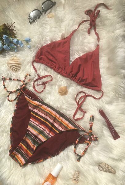 Ensemble lingerie femme: soutien-gorge rose et culotte à rayures. Confortable et doux pour un look tendance au quotidien.