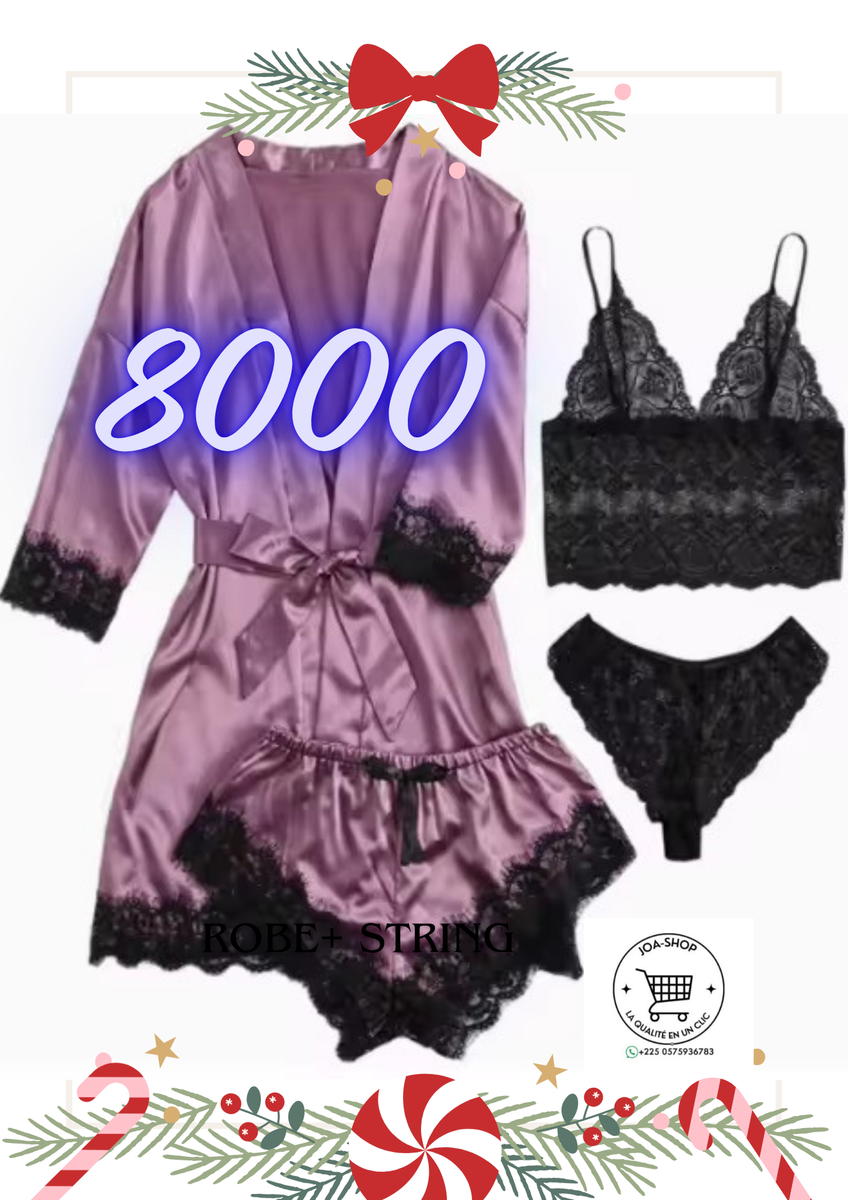 Découvrez notre ensemble de lingerie en satin et dentelle, idéal pour une soirée spéciale. Comprend un peignoir élégant et un ensemble soutien-gorge et culotte en dentelle délicate. Parfait pour se sentir confiante et séduisante à la maison ou offrir en cadeau. Confort and style garantis!