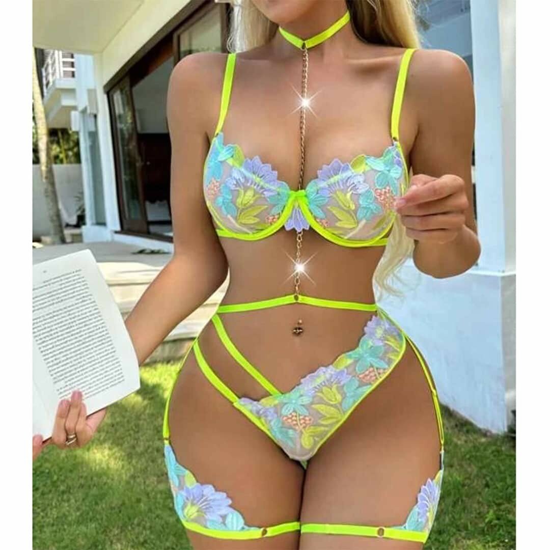 Découvrez cet ensemble de lingerie sexy avec broderie florale et détails néon. Parfait pour pimenter vos soirées spéciales. Confortable et élégant, il est idéal pour se sentir confiante et séduisante. Un incontournable pour toute garde-robe glamour.