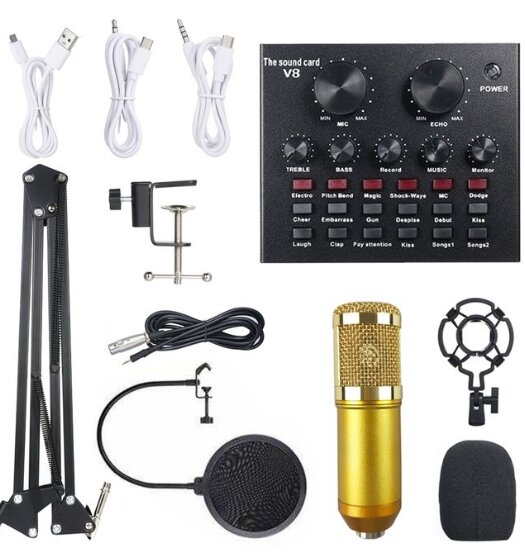 Ensemble de microphone V8 professionnel avec carte son pour streaming, gaming et podcasting. Comprend un bras ajustable, support antichoc, filtre anti-pop et câbles. Idéal pour un enregistrement audio de haute qualité à domicile.