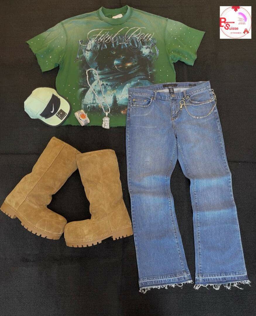 Découvrez cet ensemble mode pour homme comprenant un T-shirt graphique vert, un jeans bleu décontracté et des bottes en daim marron. Parfait pour un look urbain et confortable.
