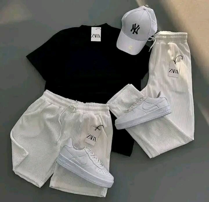 Ensemble mode homme comprenant un t-shirt noir, un short et pantalon blanc ZARA, chaussures et casquette assorties