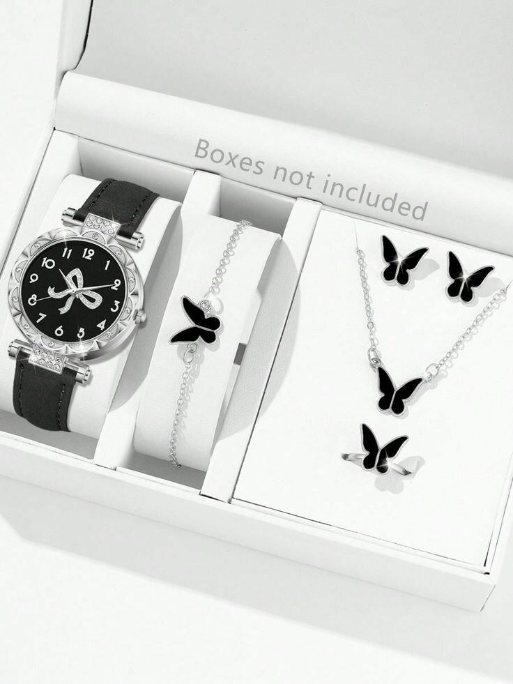 Découvrez notre élégant ensemble de montre et bijoux papillon. Comprenant une montre stylée, un bracelet chic, un collier raffiné, et des boucles d'oreilles scintillantes. Parfait pour un cadeau ou pour sublimer votre tenue quotidienne. Matériaux de haute qualité pour un confort longue durée. Idéal pour les femmes soucieuses de leur style.