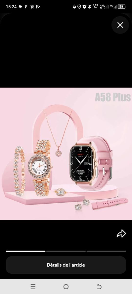 Découvrez l'élégance technologique avec l'ensemble A58 Plus : une montre connectée chic accompagnée d'accessoires glamour. Parfait pour la femme moderne, il allie fonction et style, idéal pour le quotidien et les occasions spéciales. Ne manquez pas ce must-have tendance!
