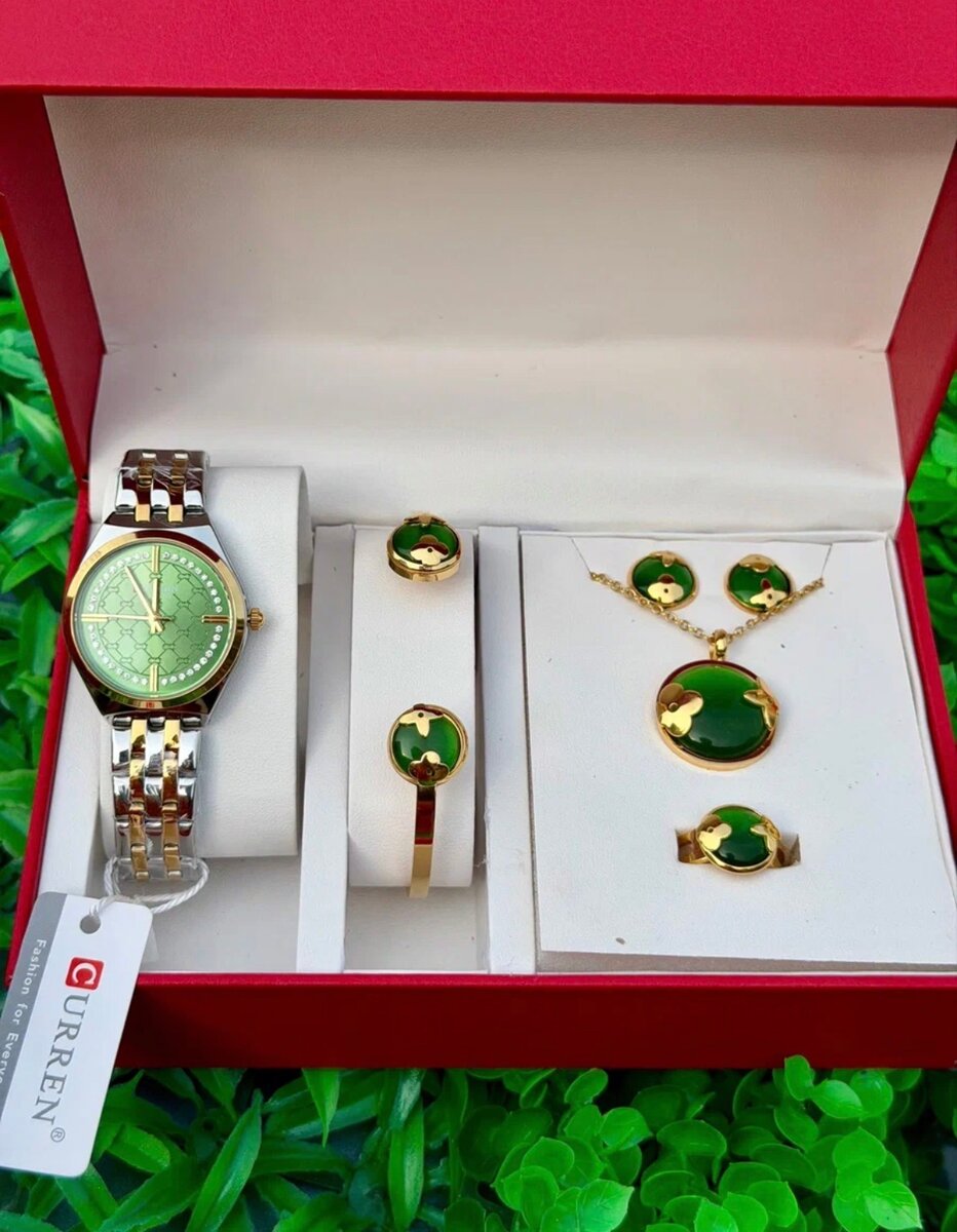 Découvrez cet ensemble élégant comprenant une montre Curren et des bijoux assortis, un cadeau idéal. La montre et les bijoux sont ornés de pierres vertes et d'un design doré, offrant un style raffiné.