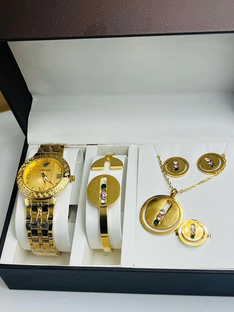 Découvrez notre ensemble de montre et bijoux dorés. Idéal pour un cadeau luxueux, chaque pièce est élégamment conçue avec une attention aux détails. Parfait pour sublimer n'importe quelle tenue avec une touche de sophistication. Un choix parfait pour toutes les occasions.