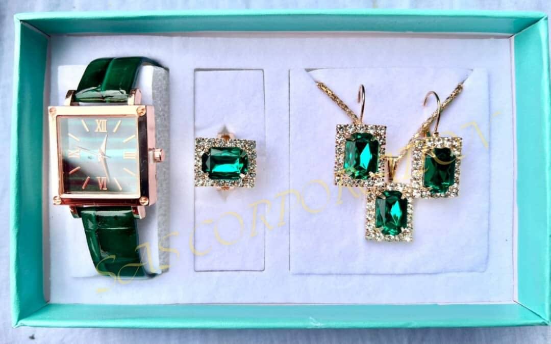 Élégant ensemble comprenant une montre-bracelet avec bracelet en cuir vert et cadran doré, complété par une parure de bijoux en émeraude: pendentif, boucles d'oreilles et bague. Idéal pour les occasions spéciales ou un cadeau raffiné.