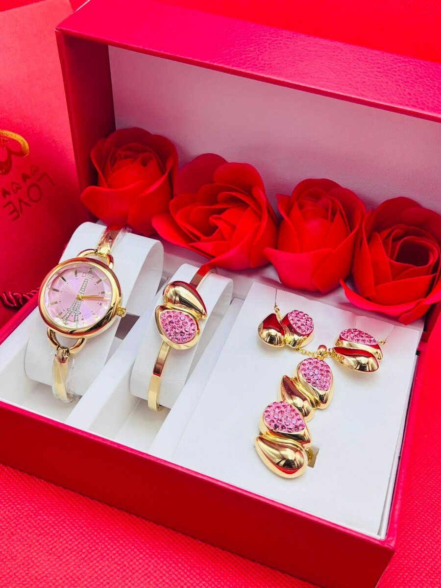 Coffret cadeau comprenant une montre, un bracelet et des boucles d'oreilles en or rose avec pierres roses. Idéal pour les femmes élégantes. Livré avec des roses rouges.