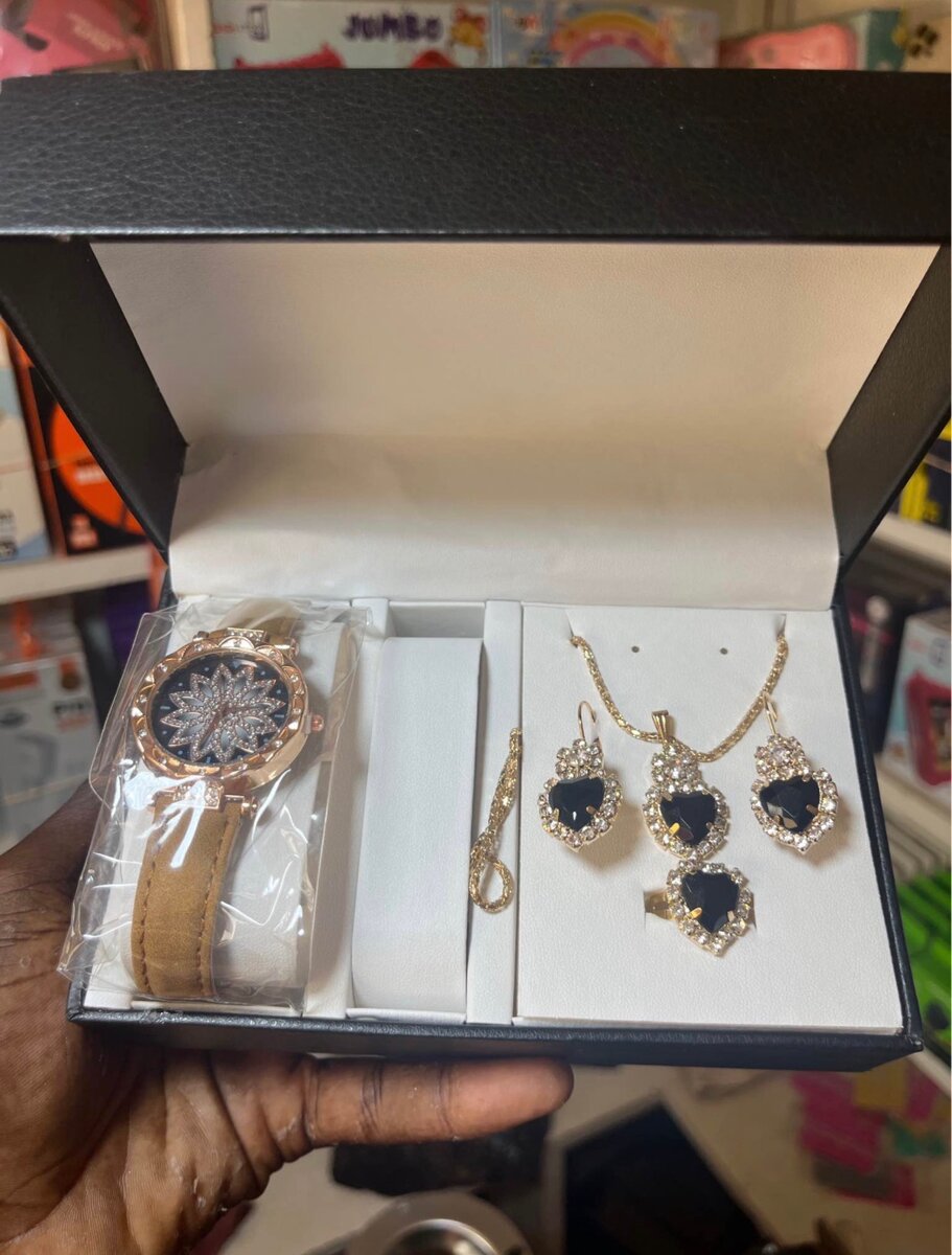 Découvrez cet ensemble élégant comprenant une montre et des bijoux en or, parfait pour les femmes qui aiment le luxe. Contient une montre avec bracelet, un collier et des boucles d'oreilles avec pierres noires.