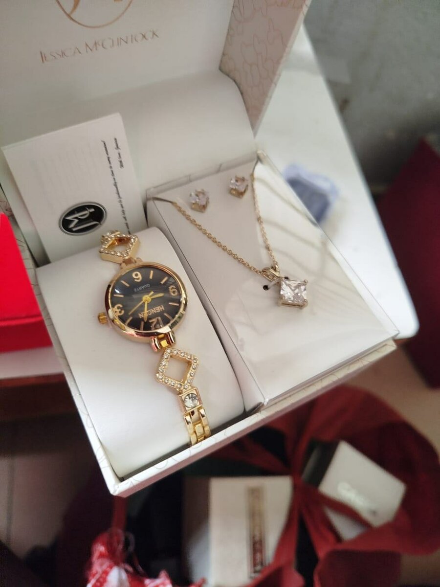 Découvrez cet ensemble élégant comprenant une montre et des bijoux en or, parfait pour les occasions spéciales. La montre arbore un design classique avec un cadran noir et des chiffres dorés, tandis que les bijoux sont ornés de détails scintillants. Un cadeau idéal pour elle.