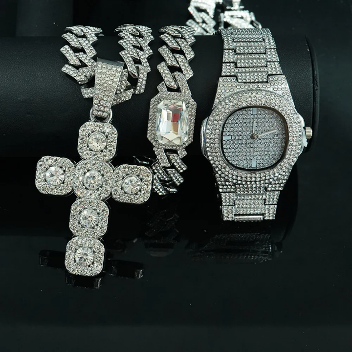 Découvrez cet ensemble élégant comprenant une montre, un bracelet et un pendentif croix, parfait pour les hommes qui aiment le luxe. Fabriqué avec des matériaux de haute qualité et des détails soignés, cet ensemble est idéal pour les occasions spéciales ou comme cadeau.