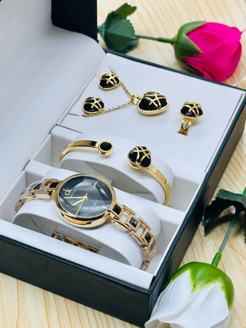 Découvrez cet ensemble élégant comprenant une montre, un bracelet, des boucles d'oreilles et un collier, le tout en métal doré avec des accents noirs. Un cadeau idéal pour elle.