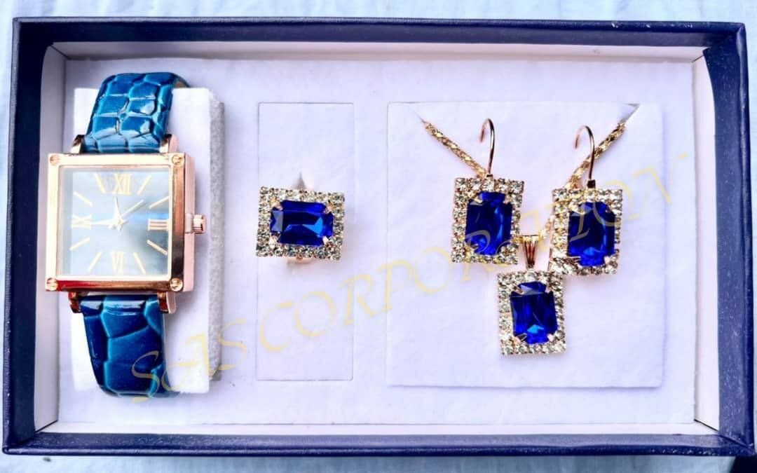 Élégant ensemble de montre et bijoux avec saphirs éclatants. Idéal pour une soirée chic ou comme cadeau inoubliable. Bracelet en cuir, monture dorée. Adoptez le luxe au quotidien !