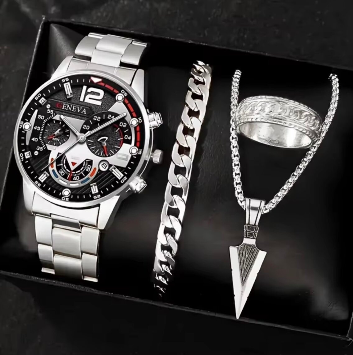 Découvrez notre élégant ensemble pour homme : montres chronographe Geneva en acier inoxydable avec bracelet chaîne, bague sculptée et pendentif tendance. Parfait pour ajouter une touche sophistiquée à toute tenue, occasion spéciale ou usage quotidien. Idéal pour offrir.