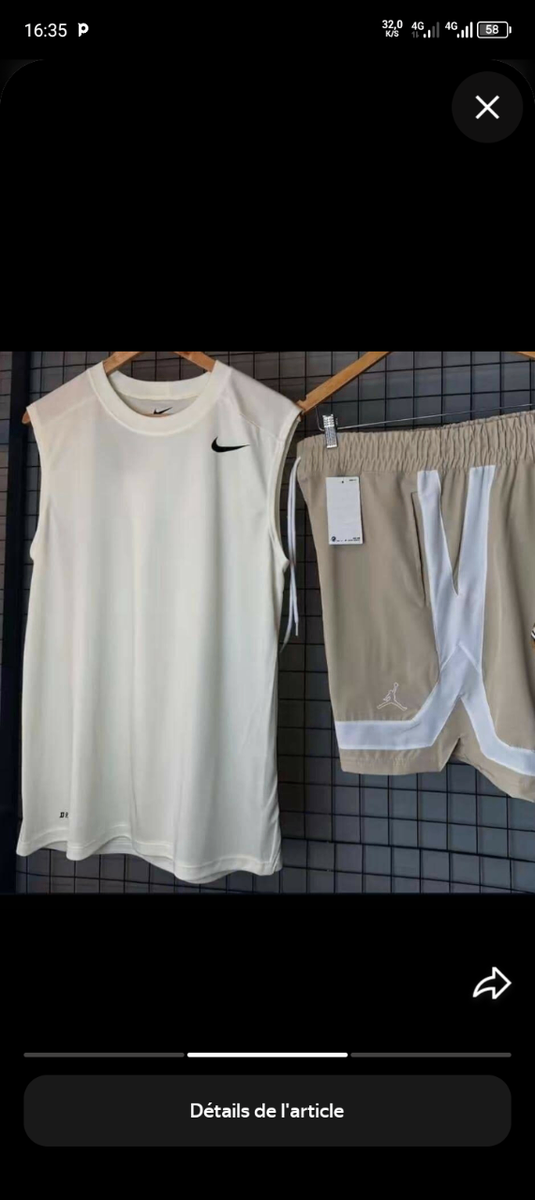 Découvrez cet ensemble de sport Nike pour homme, comprenant un débardeur blanc et un short beige. Parfait pour les entraînements ou les activités sportives, cet ensemble est conçu pour offrir confort et style. Le débardeur est léger et respirant, tandis que le short est conçu pour une liberté de mouvement maximale.