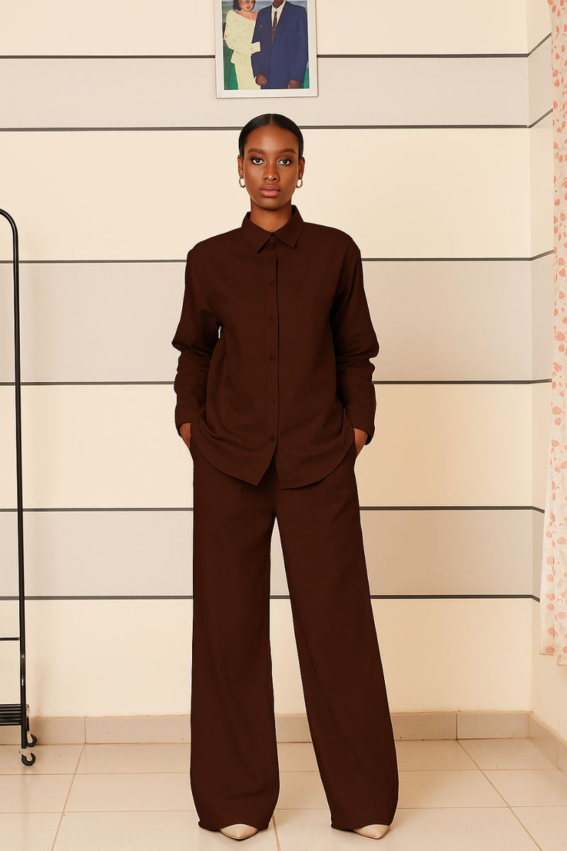 Découvrez cet ensemble élégant de chemise et pantalon marron pour femme, idéal pour un look sophistiqué au quotidien ou pour le bureau. Confortable et chic, il s'adapte à toutes les occasions et met en valeur votre style avec simplicité et raffinement.