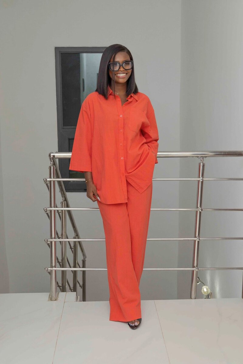 Parfait pour une tenue élégante et moderne. Cet ensemble comprend un pantalon et une chemise orange qui s'assemblent parfaitement pour un look tendance.