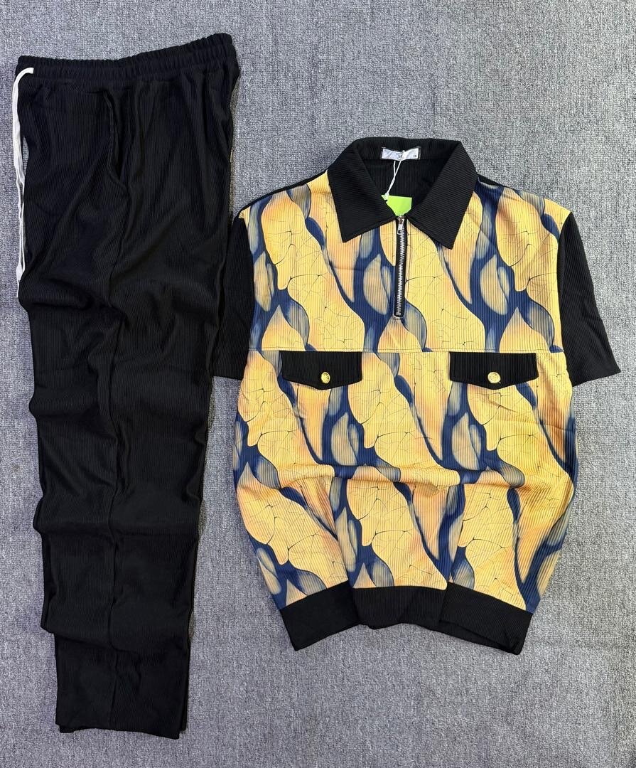 Découvrez cet ensemble élégant comprenant un polo audacieux avec motifs uniques et un pantalon noir confortable. Idéal pour une tenue décontractée mais stylée, parfait pour l'été et les soirées. Confort ultime avec une touche de style moderniste. Ne passez pas à côté de cette opportunité de renouveler votre garde-robe !