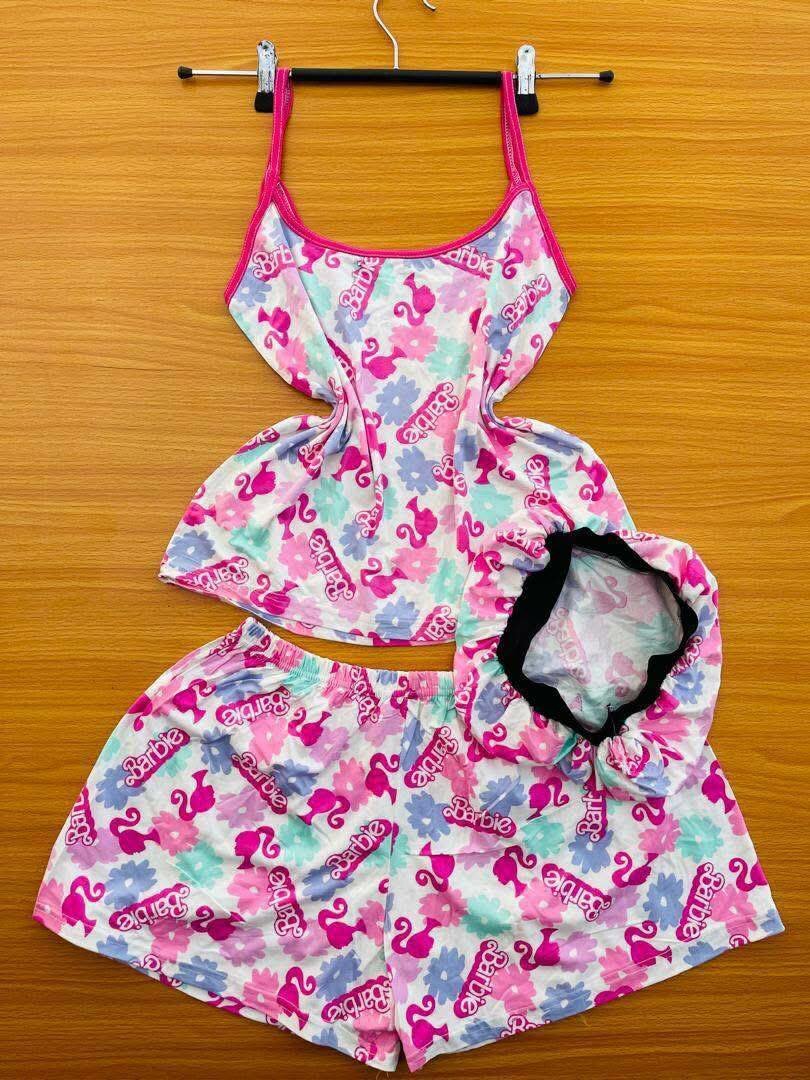 Ensemble pyjama 3 pièces pour fille avec un motif coloré. Confortable et doux, il comprend un haut à bretelles, un short et un bonnet.