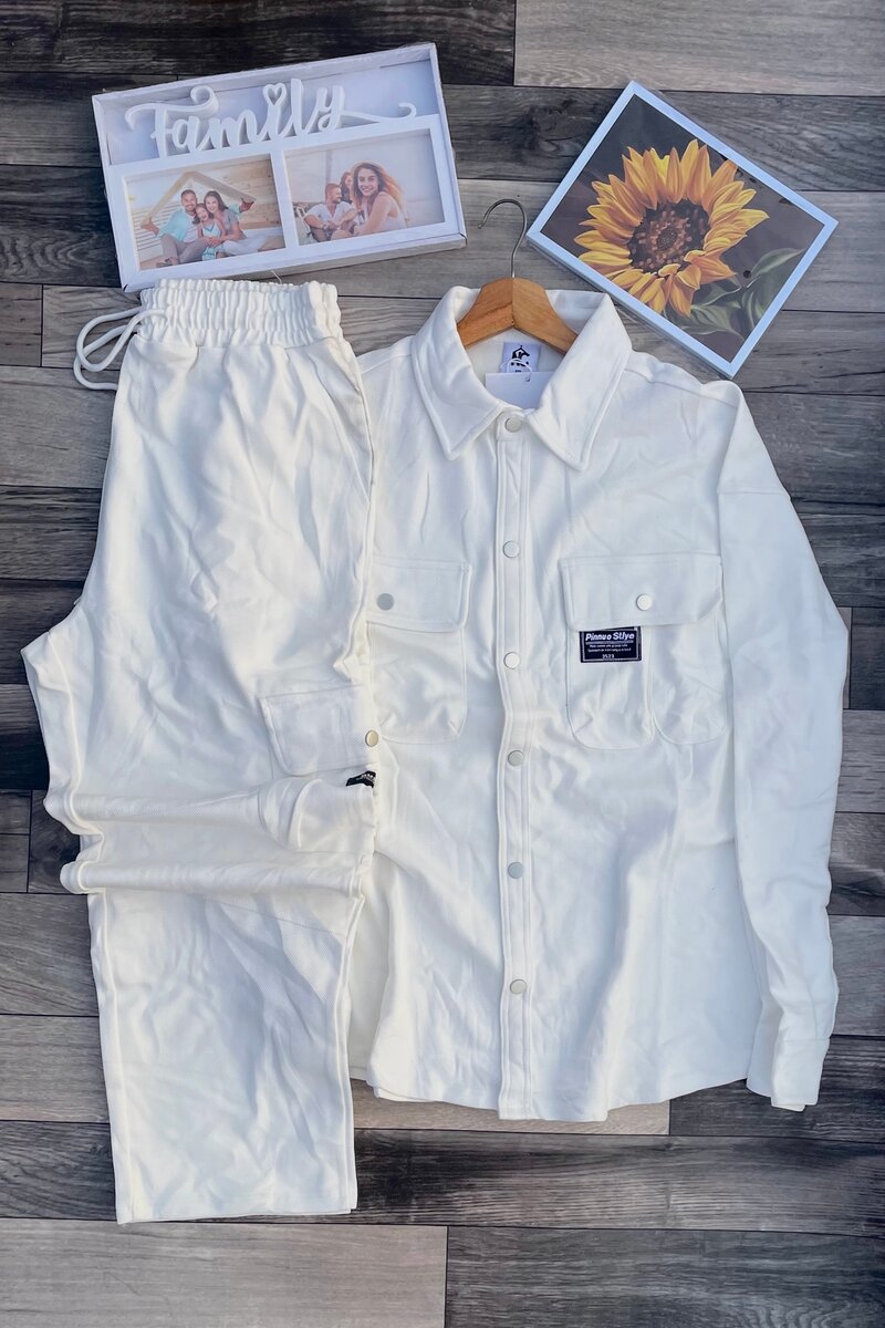 Pyjama femme blanc composé d'une chemise et d'un pantalon confortable. Idéal pour un sommeil paisible ou une soirée détente à la maison.