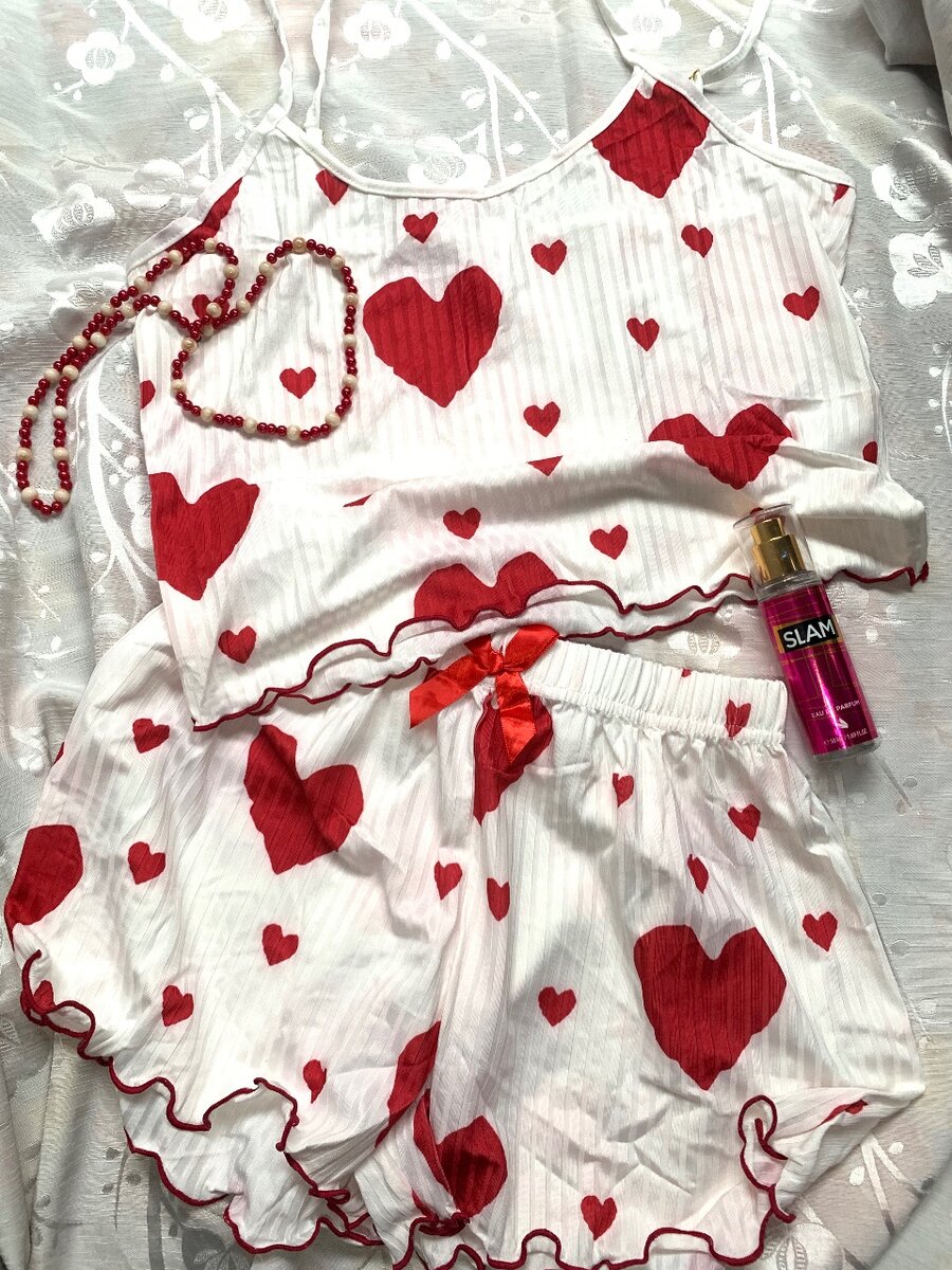 Charmant ensemble pyjama pour femme, comprenant un débardeur léger et un short confortable. Motifs cœurs et lèvres pour un look séduisant. Idéal pour des nuits douces ou comme cadeau romantique. Disponible en plusieurs couleurs séduisantes.