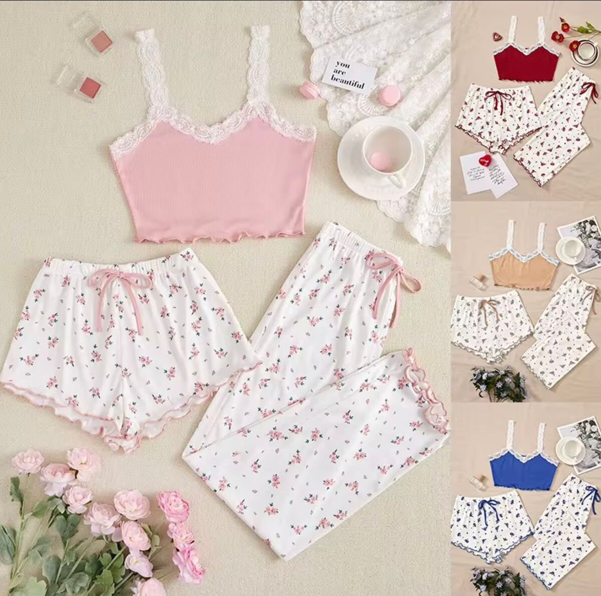 Découvrez cet ensemble pyjama féminin et élégant avec un motif floral délicat. Confortable pour une nuit paisible, il comprend un haut à bretelles et des bas assortis. Idéal pour se détendre à la maison. Disponible en plusieurs couleurs.