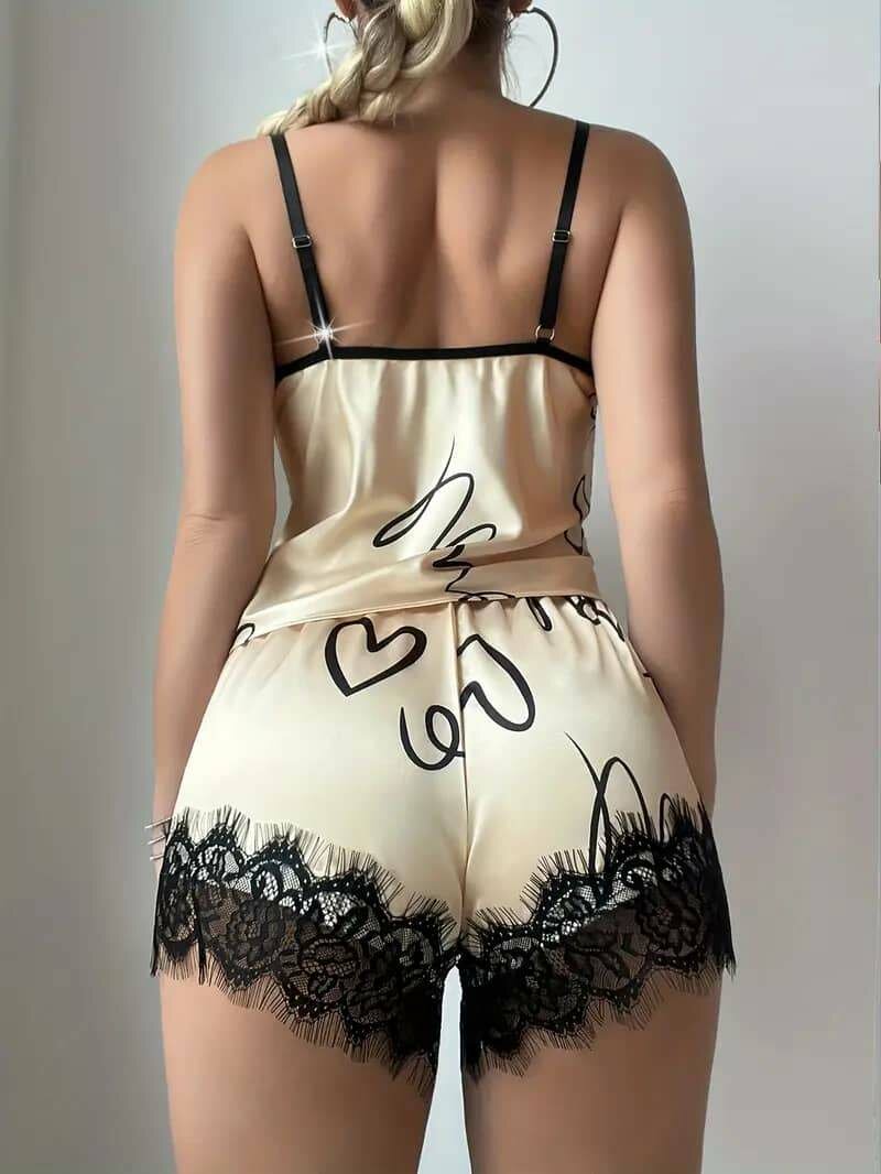 Découvrez cet ensemble pyjama en satin doux, orné de dentelle délicate et de motifs tendance. Parfait pour une nuit confortable ou un moment de détente. Idéal pour les soirées décontractées ou comme cadeau glamour.