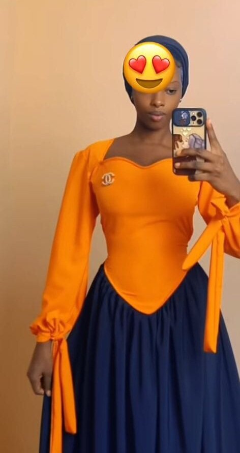 Découvrez cette magnifique robe pour femme, alliant une jupe bleu marine avec un haut orange vif à manches longues. Confectionnée avec soin, cette tenue est parfaite pour des occasions spéciales ou une soirée élégante.