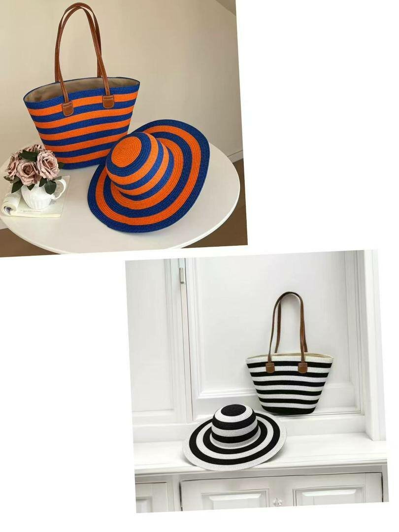 Élégant ensemble de sac et chapeau d'été à rayures pour un style estival chic. Parfait pour la plage ou les sorties en plein air. Disponible en plusieurs couleurs vives et naturelles. Matériaux légers et durables pour un confort optimal.