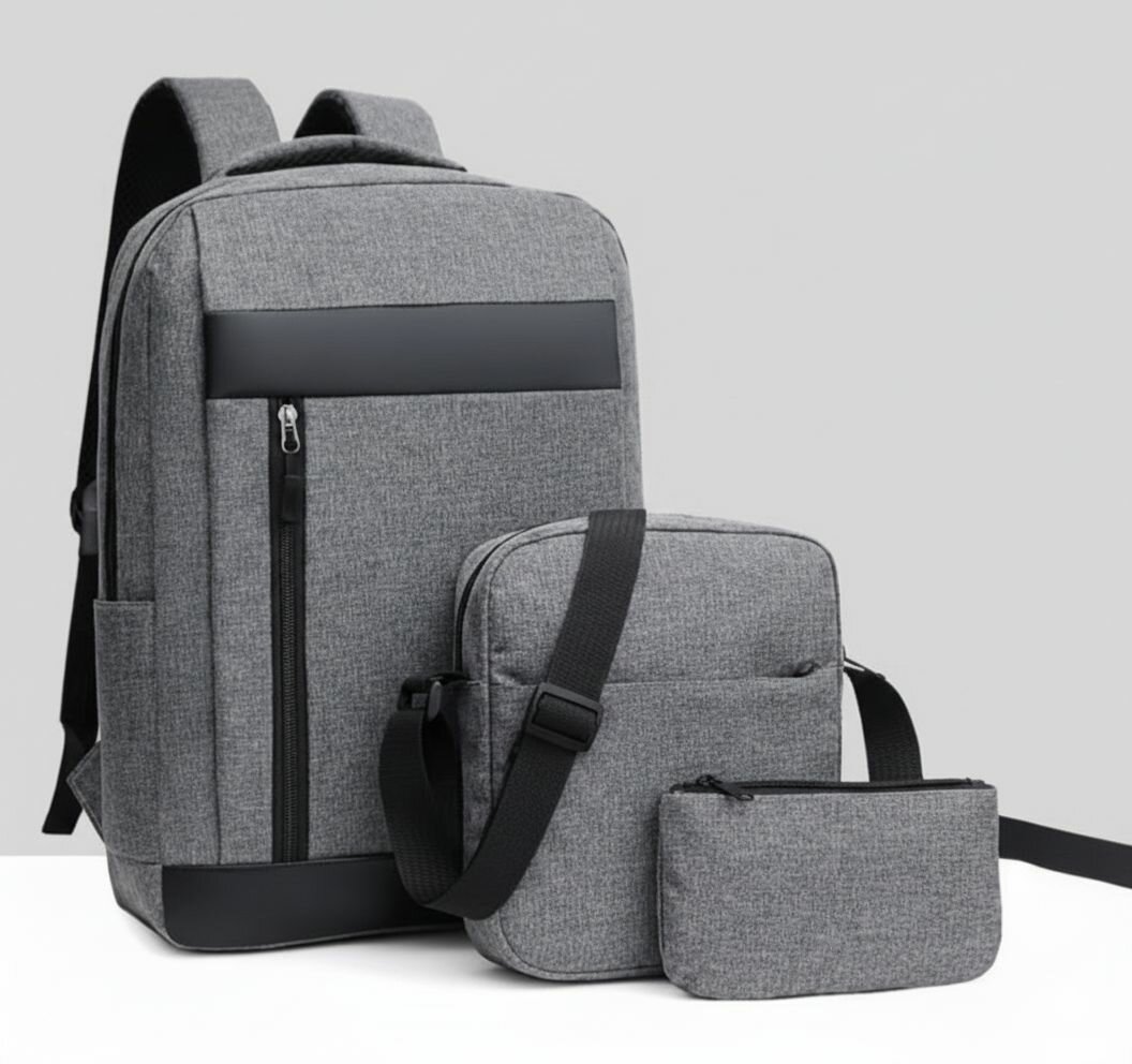 Cet ensemble de sacs à dos, comprenant un sac à dos principal, une sacoche et une pochette, est idéal pour les professionnels et les étudiants. Fabriqué en matériau durable, il offre une solution pratique et élégante pour transporter votre ordinateur portable, vos documents et vos essentiels quotidiens. Parfait pour les déplacements urbains et les voyages.