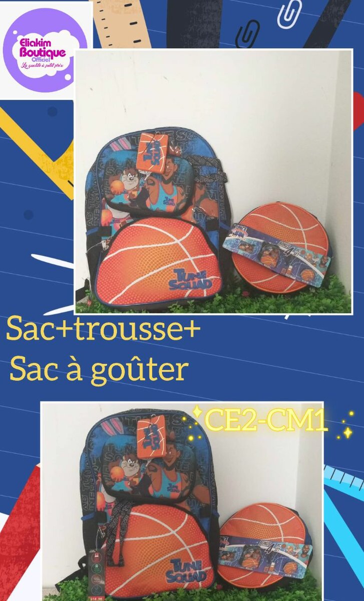Ensemble trois pièces comprend un sac à dos, une trousse et un sac à goûter assortis. Idéal pour l'école et les activités sportives.