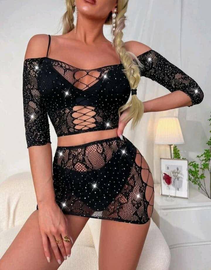 Transformez votre garde-robe avec cet ensemble noir audacieux et scintillant. Conçu en dentelle élégante avec des détails en maille révélateurs, il est idéal pour des soirées spéciales. La coupe ajustée et les manches 3/4 ajoutent une touche de sophistication. Parfait pour se démarquer lors de fêtes ou événements glamour.