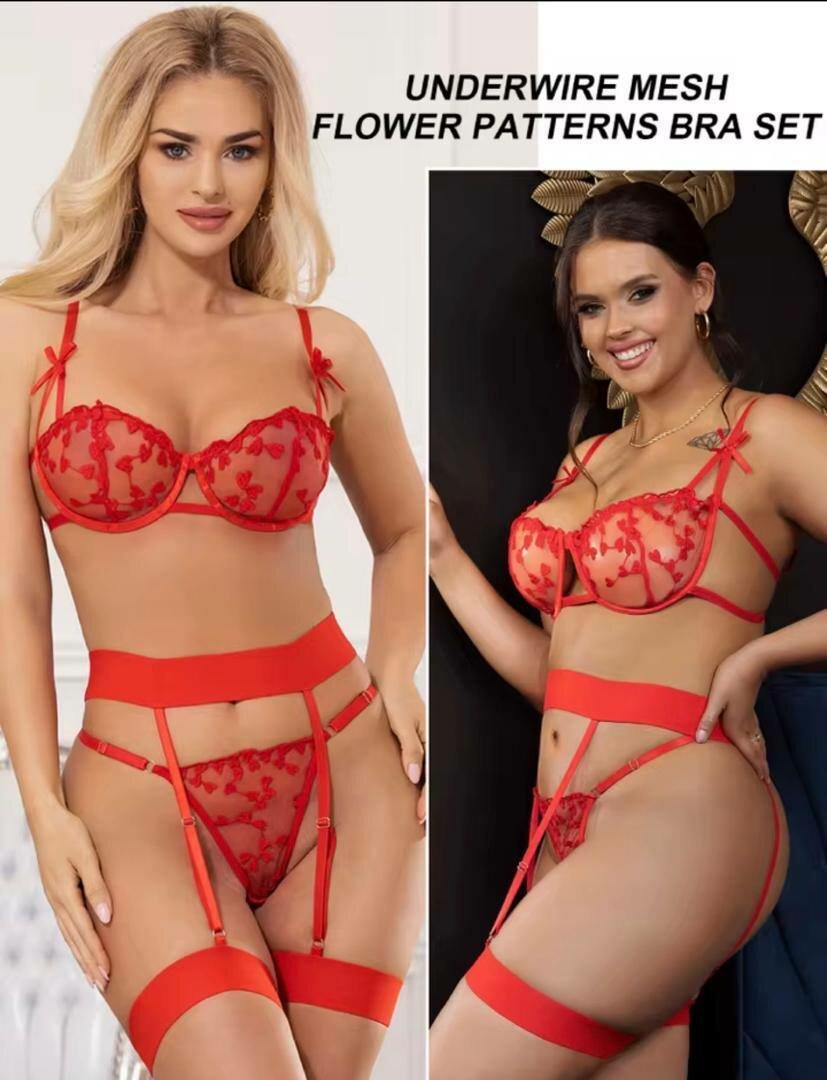 Découvrez notre ensemble soutien-gorge rouge en dentelle avec des motifs floraux, composé d'un soutien-gorge, d'une culotte et de jarretelles. Parfait pour les occasions spéciales, cet ensemble est conçu pour vous faire sentir séduisante et élégante. Disponible en plusieurs tailles.