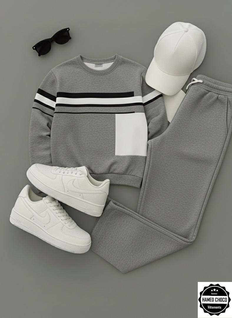 Découvrez cet ensemble décontracté et stylé composé d'un pull à rayures et d'un pantalon assorti. Idéal pour un look quotidien ou des sorties détendues. Complet avec des baskets blanches et une casquette, ce set apporte confort et allure sportive. Parfait pour les amateurs de mode souhaitant combiner style et praticité.