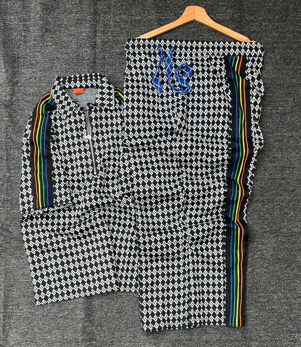 Ce magnifique ensemble sport offre à la fois style et confort, parfait pour l'homme moderne. Conçu avec un motif géométrique chic et des bandes latérales multicolores vibrantes, cet ensemble attire les regards. Idéal pour les activités sportives ou les sorties décontractées, sa fermeture éclair pratique et sa matière légère vous garantissent une aisance totale. Adoptez un look tendance et distinctif!