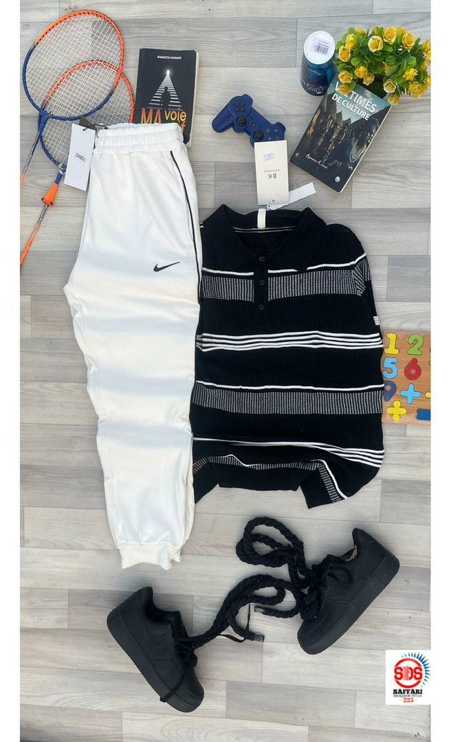 Optez pour cet ensemble sport chic, idéal pour les activités sportives ou une journée décontractée. Composé d'un polo rayé noir et blanc, d'un pantalon de jogging confortable et de baskets noires. Parfait pour allier style et confort.