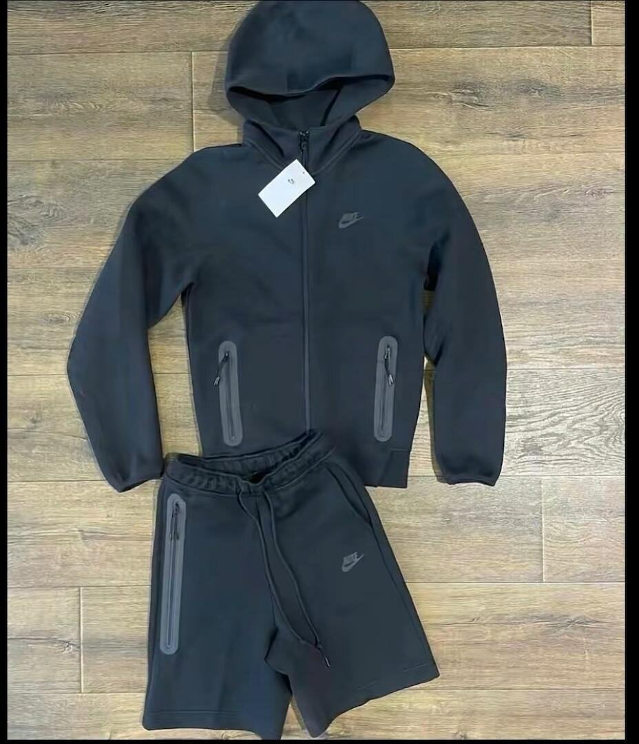 Ensemble sportif en noir avec sweat à capuche et short, idéal pour le sport et les loisirs. Tissu confortable et poches pratiques. Parfait pour un style décontracté et actif.