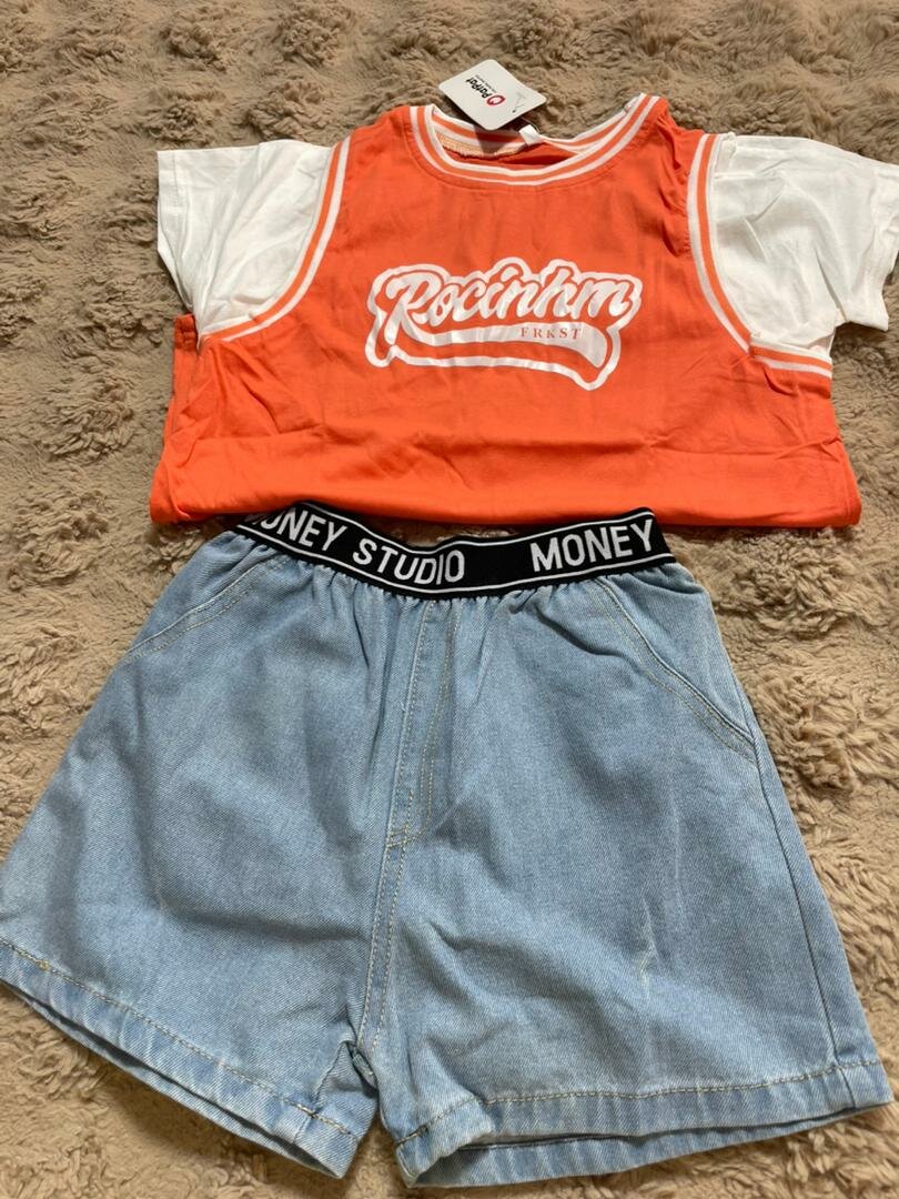 Cet ensemble sportif pour enfants se compose d'un t-shirt débardeur orange et d'un short en jean. Parfait pour les activités quotidiennes, il garantit confort et style.