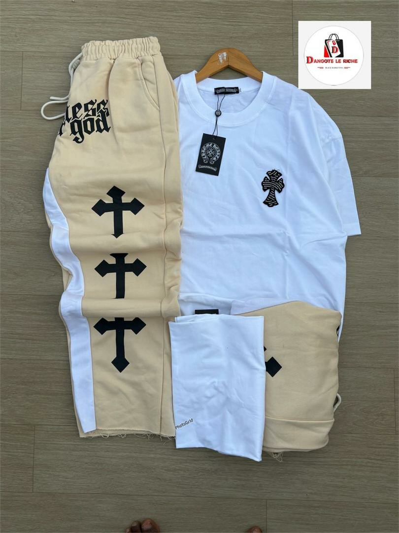 Optez pour cet ensemble streetwear moderne, parfait pour un look décontracté et stylé. Le t-shirt blanc avec motif croix et le short camel assorti sont idéaux pour toutes occasions urbaines. Faites impression tout en restant à l'aise!
