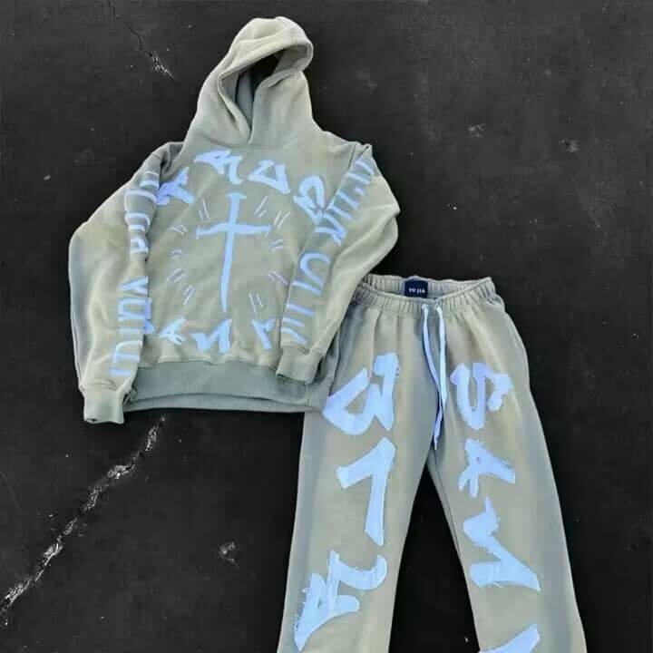 Ensemble survêtement gris pour homme comprenant un sweat à capuche et un pantalon de jogging. Conçu pour un confort optimal et un style décontracté. Idéal pour les activités sportives ou le quotidien.