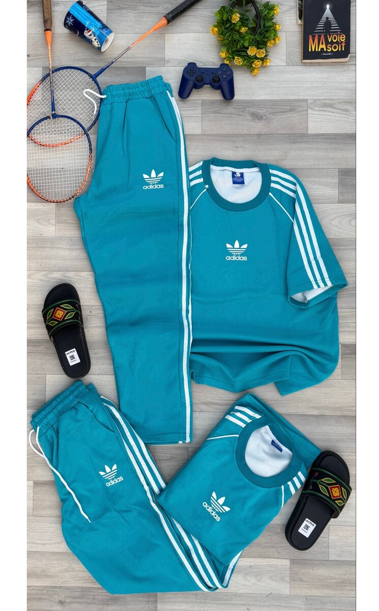 Ensemble survêtement Adidas comprenant un t-shirt et un pantalon, idéal pour le sport ou les activités décontractées. Conçu pour le confort et la performance.