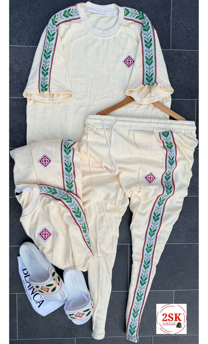 Ensemble survêtement blanc avec logo et motifs verts et rouges. Clic,choisi. On te livre.