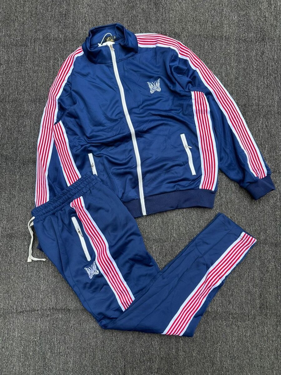 Survêtement homme bleu avec bandes rouges et blanches. Conçu pour le sport et le style décontracté. Matériau confortable et respirant.