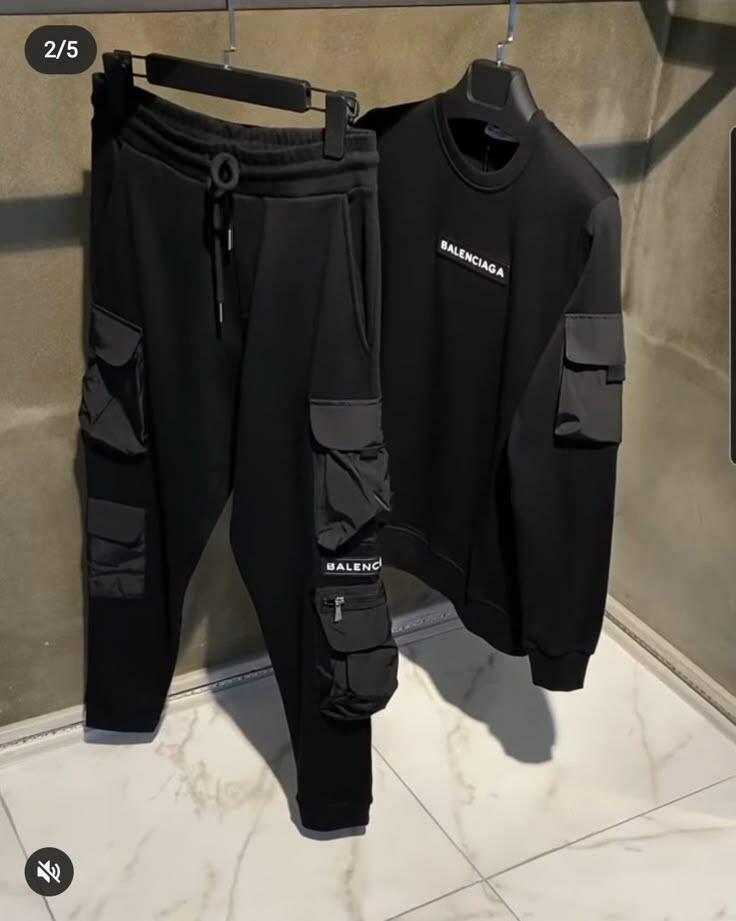 Ensemble survêtement cargo noir pour homme comprenant un sweat-shirt et un pantalon. Conçu pour allier confort et style, cet ensemble est idéal pour les activités sportives ou pour une tenue décontractée.
