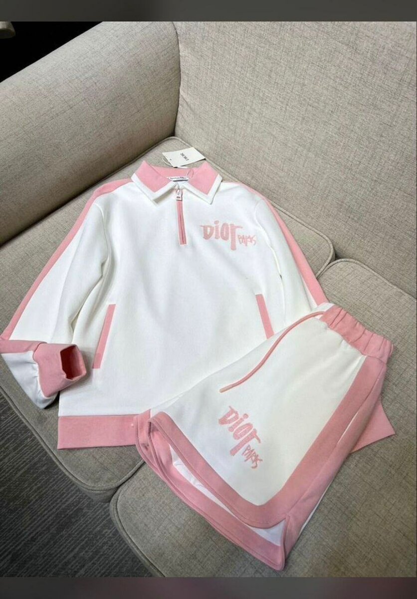 Ensemble survêtement Dior en blanc et rose ou gris pour femmes. Conçu pour le confort et le style, cet ensemble comprend une veste zippée et un pantalon assorti. Idéal pour les activités sportives ou le quotidien décontracté.