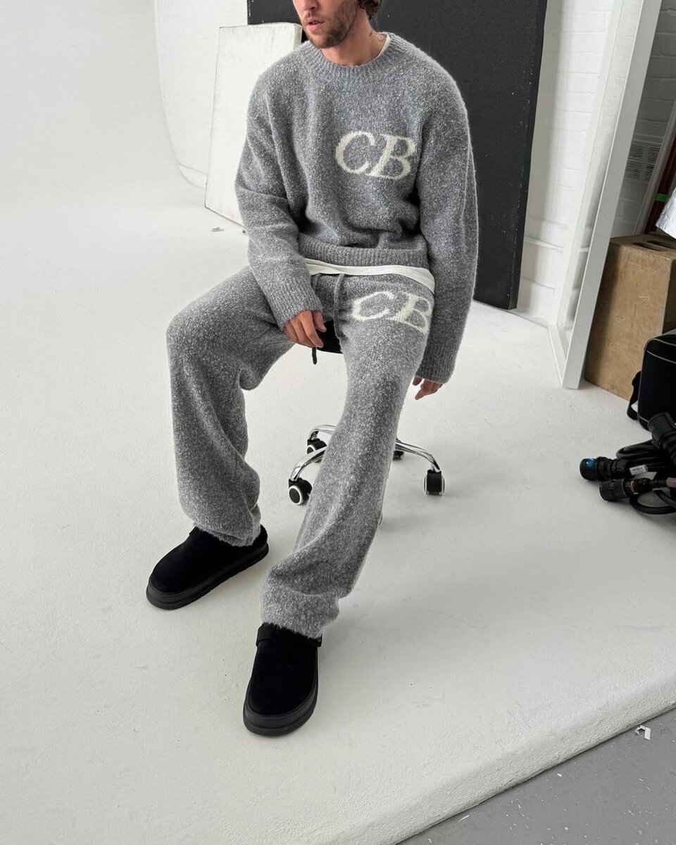 Élégant ensemble survêtement en tricot gris avec lettrage CB. Confortable et tendance, idéal pour les sorties décontractées ou le quotidien. Fabriqué pour un confort optimal.