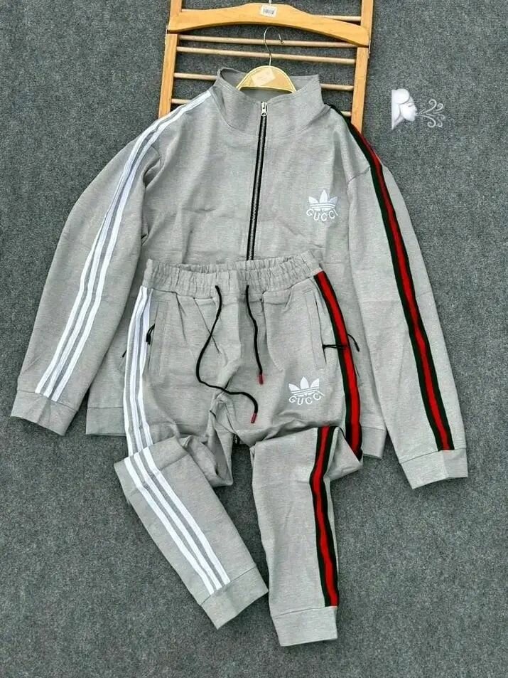 Survêtement gris pour homme avec veste à capuche et pantalon. Conçu pour le sport et le quotidien. Logo Adidas et bandes distinctives. Tissu confortable et résistant.