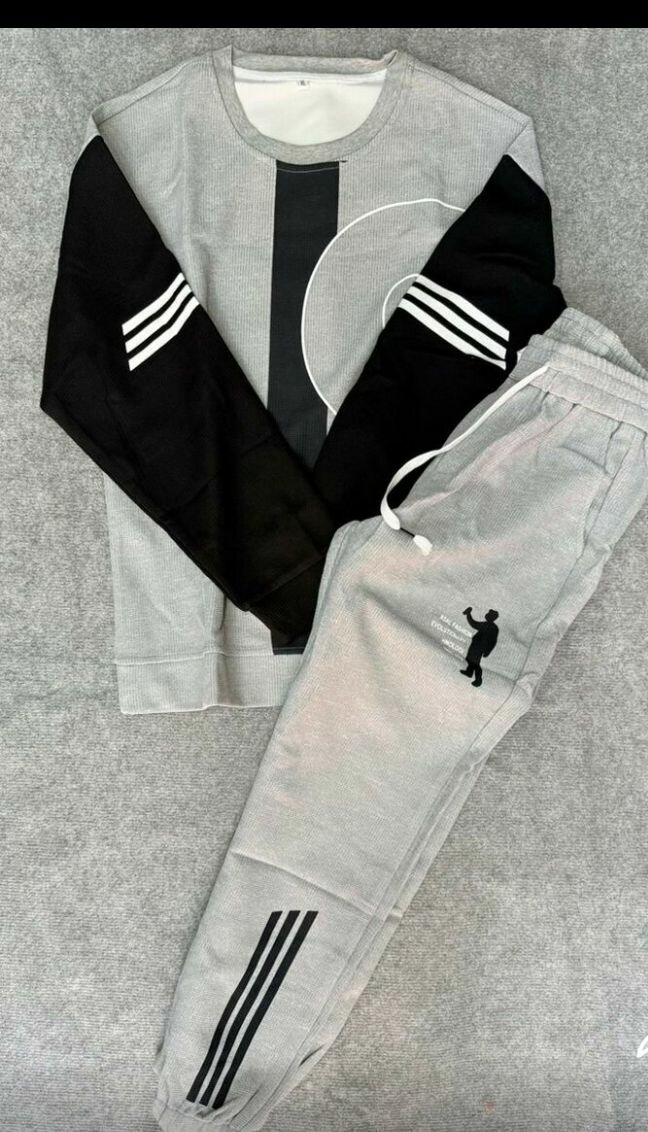 Survêtement homme gris et blanc/noir, confortable et élégant. Idéal pour le sport et les activités quotidiennes. Confectionné en tissu de qualité pour un maximum de confort.